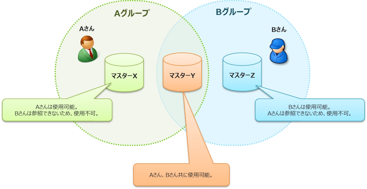 カスタムマスターごとにグループ別権限設定を行えます。 ユーザーグループごとの設定となるため、ユーザーはいずれかのグループに属している必要があります。