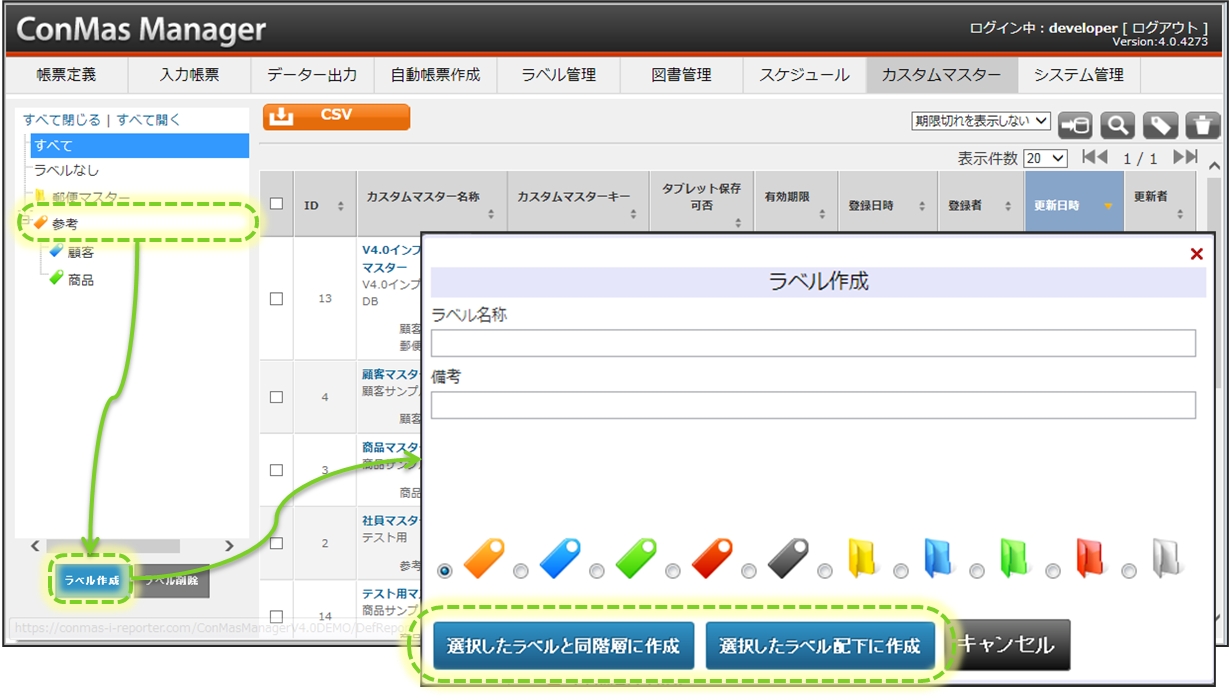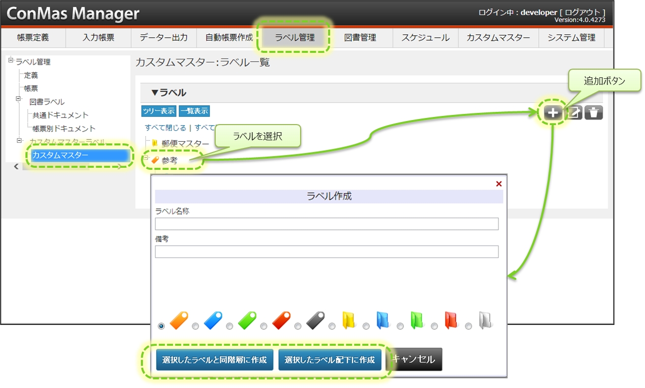 「ラベル管理」画面の左ツリーにある、「カスタムマスター」をクリックします。 画面右上の「追加(+)」ボタンをクリックします。 既存のラベルの下にラベルを追加するには、ラベルを選択した状態で「追加(+)」ボタンをクリックします。
