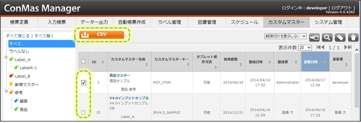 複数のカスタムマスターにチェックをいれると1つのCSVにまとめてダウンロードされます。