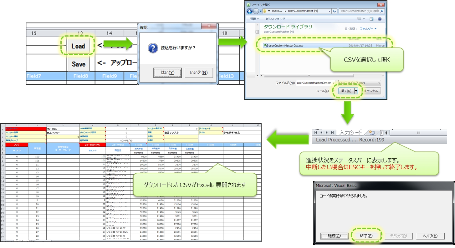 「 CustomMasterInputSheet.xlsb 」に、ダウンロードしたCSVを展開します。