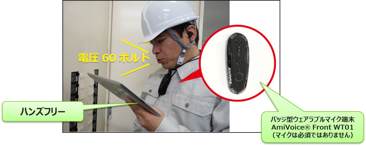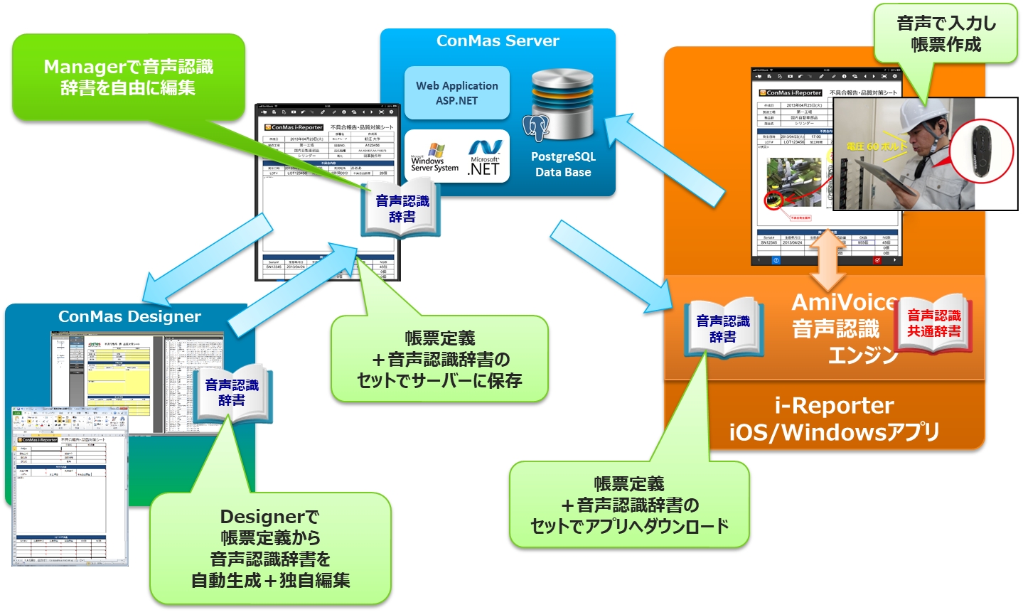i-Reporterアプリに、(株)アドバンスト・メディアとの協業により AmiVoice® SDK for iOS(ローカル認識)AmiVoice® SDK for Windows(ローカル認識)を組み込み、音声入力機能を実現しています。