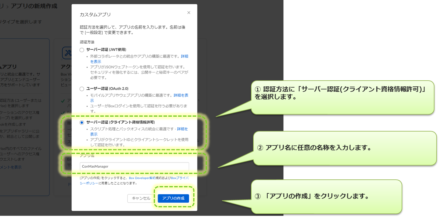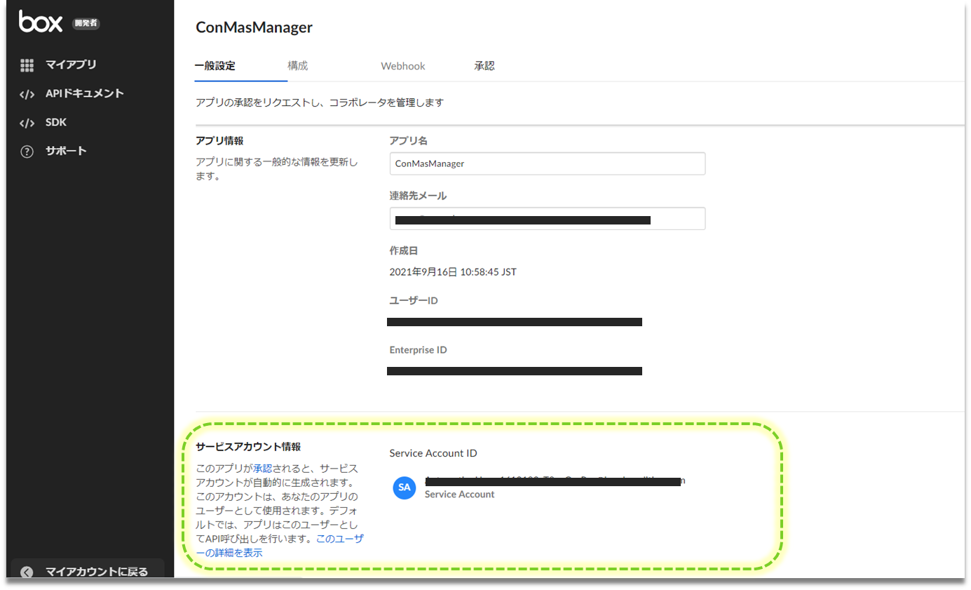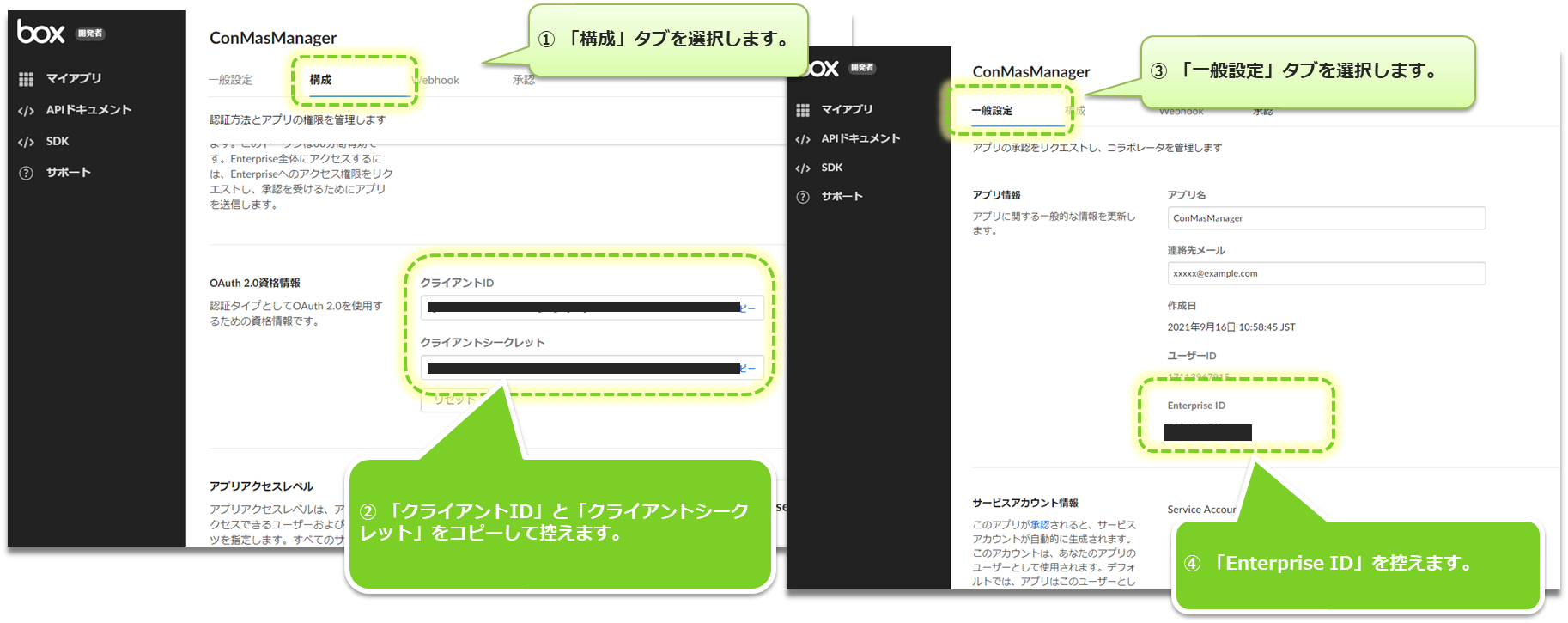 ConMas Managerの「Box連携設定」に登録する3つの情報を控えます。 必要な情報は下記です。