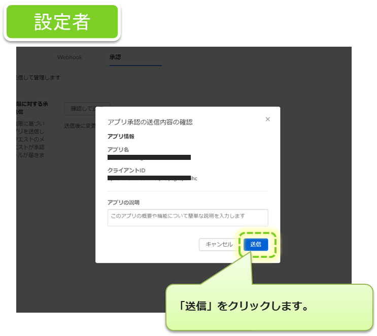 作成したアプリの「承認」タブを選択します。 「確認して送信」をクリックします。