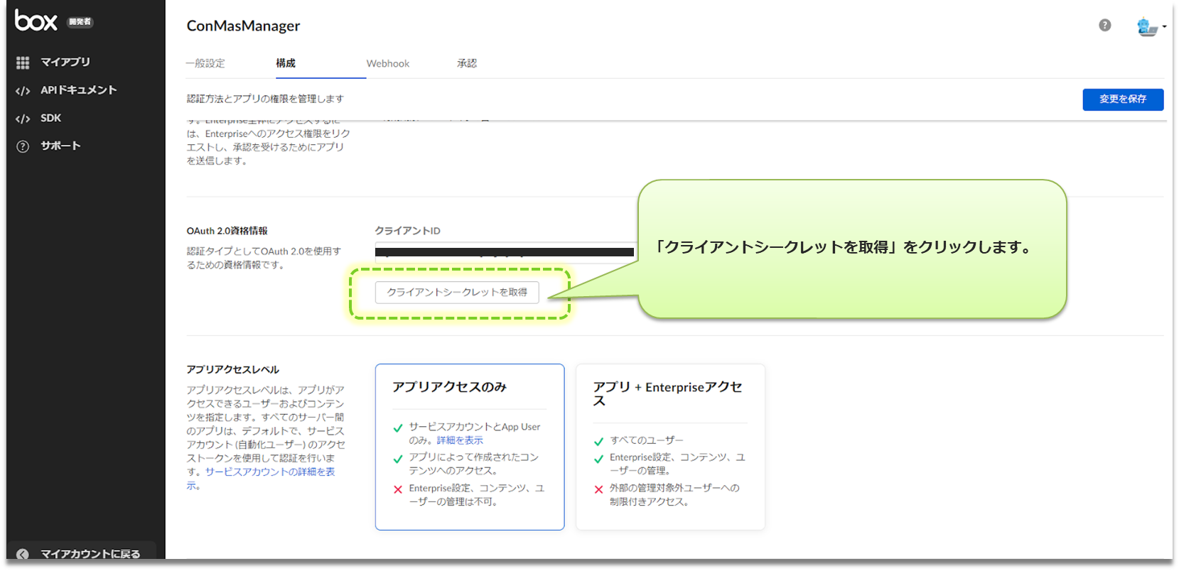 ConMas Managerの「Box連携設定」に登録する、クライアントシークレットを作成します。 作成したアプリの「構成」タブを選択します。 「クライアントシークレットを取得」をクリックします。