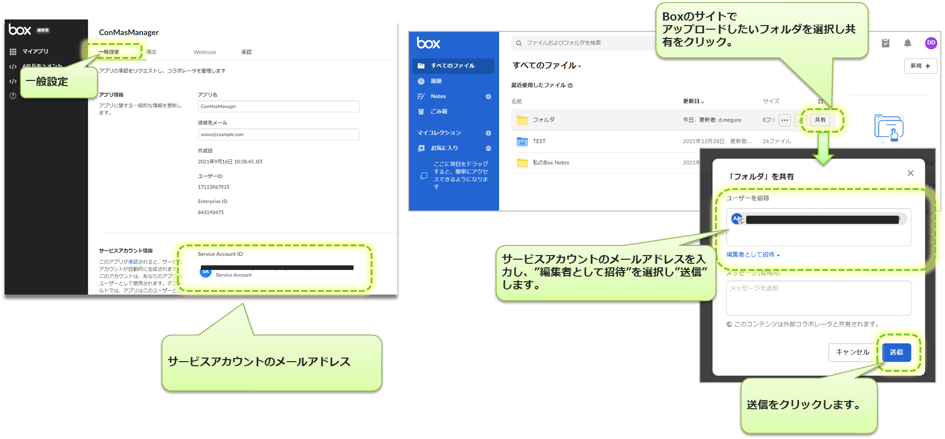 ファイルを連携するのはサービスアカウントです。 アップロードしたいフォルダーに、アービスアカウントのメールアドレスを共有設定に追加します。 作成したアプリの「一般設定」タブで、「サービスアカウントのメールアドレス」を確認します。 Boxのサイトで、アップロードしたいフォルダを選択し「共有」をクリックします。 「ユーザーを招待」に「サービスアカウントのメールアドレス」を入力し、「編集者として招待」を選択して「送信」をクリックします。