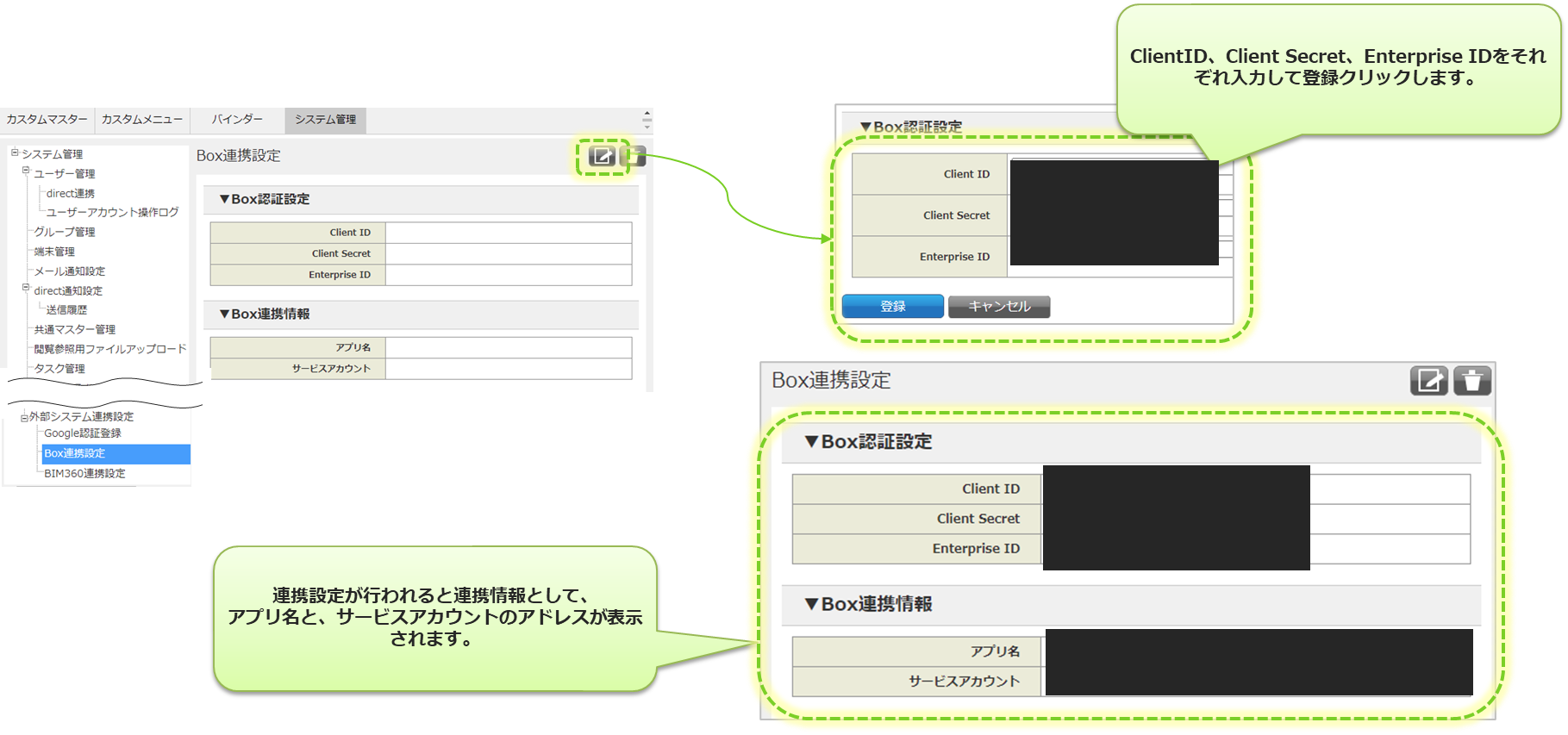 ConMasManager上部メニューの「システム管理」 > 「外部システム連携設定」 > 「Box連携設定」にて、「Box側での設定 >アプリの設定」 で控えた下記3つの設定値を入力します。