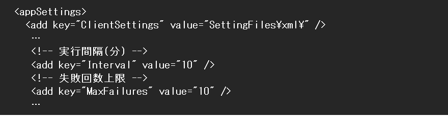 [ConMasフォルダ]\IRService\ IReporterService.exe.configをメモ帳で開き、任意の設定値をセットします。実行間隔(分): 定期実行間隔です。分単位での設定になります。最小値は1です。