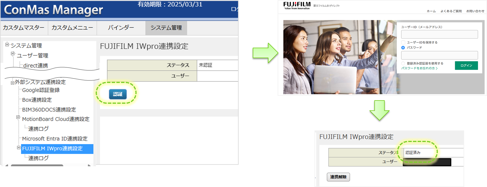 ConMasManager上部メニューの「ステム管理」 > 「外部システム連携」 > 「FUJIFILM IWpro連携設定」をクリックします。 「FUJIFILM IWpro連携設定」画面で「認証」ボタンをクリックします。