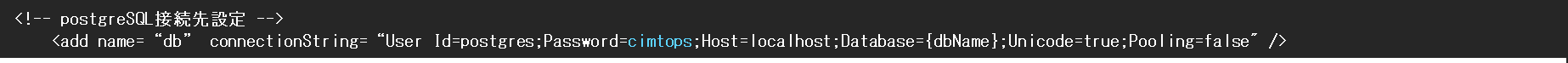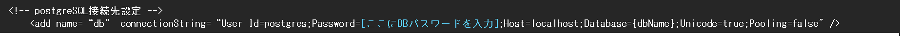 IReporterService.exe.config 内の下記記述を、環境に合わせて修正し保存します。 [ここにDBパスワードを入力]の箇所には、PostgreSQLのpostgresユーザーパスワードをセットしてください。