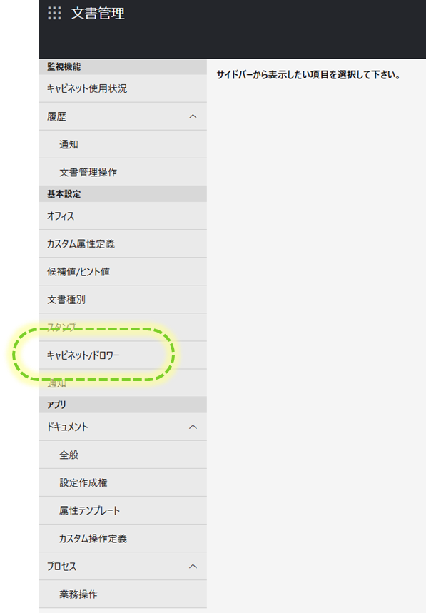 文書管理にてキャビネット、ドロワーを作成します。 キャビネット、ドロワーの作成はFUJIFILM IWproの管理者による設定となります。