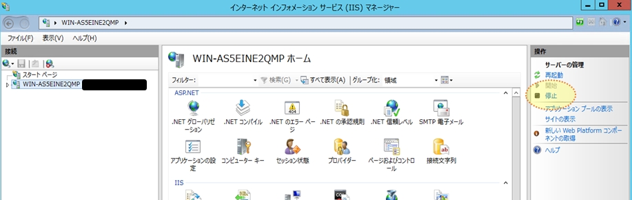 IISを停止します。 ※下記画像は WindowsServer2012R2 の例です。