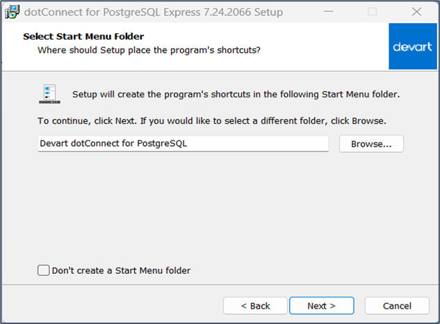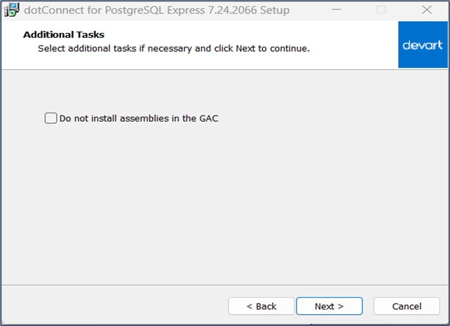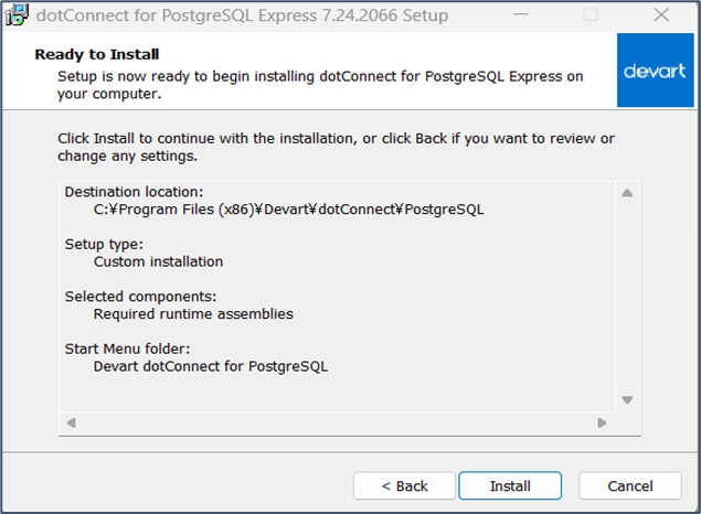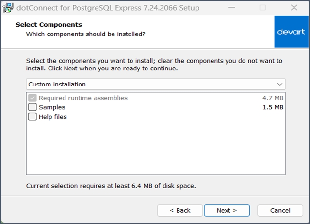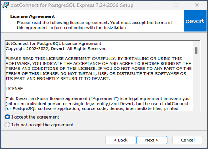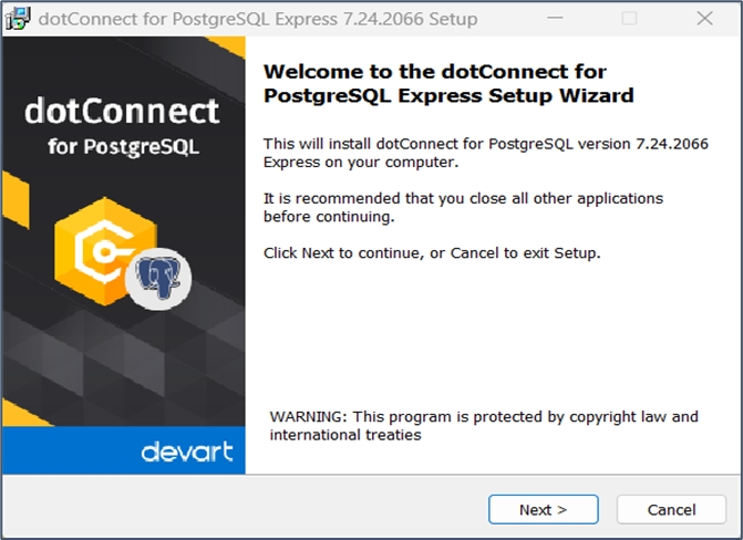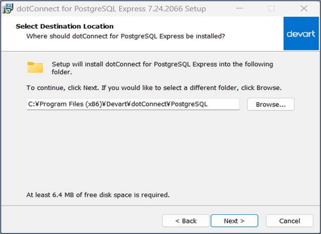 以下のファイルを実行し、dotConnectをインストールします。 事前に、以前のバージョンのものをアンインストールします。C:\ConMas\Tools\ap\dcpostgresqlfree7.24.2066.exe
