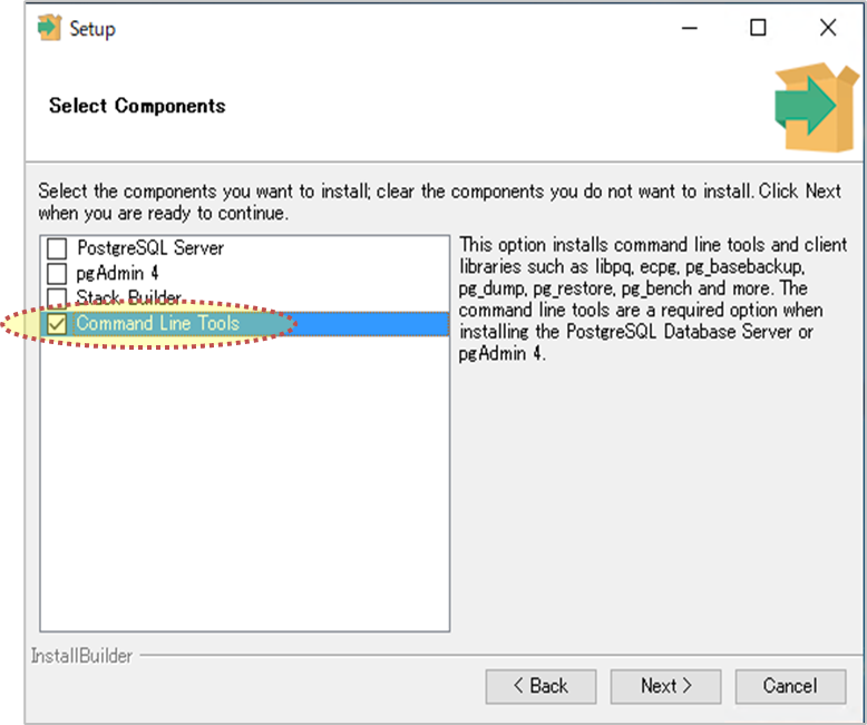 PostgreSQLのコマンドツールをインストールします。 PostgreSQLアップグレードモジュールのdbフォルダに内包しているexeファイルを実行します。 PostgreSQL14のコマンドツールの場合、postgresql-14.7-2-windows-x64.exe です。