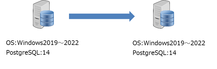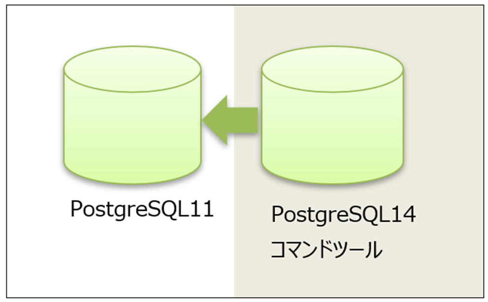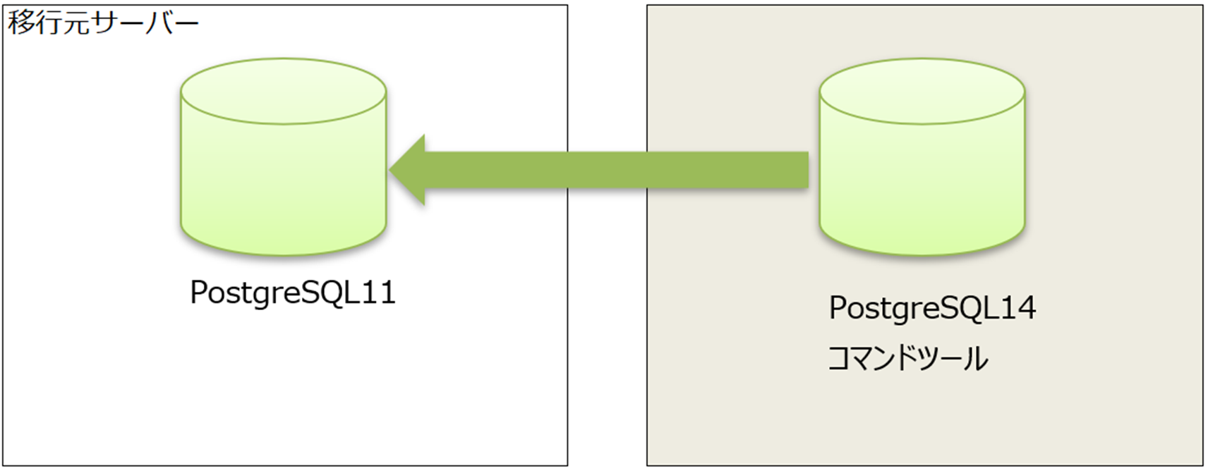 1.移行元サーバーに接続できるPostgreSQLコマンドツール環境を構築します。 このとき、導入するPostgreSQLコマンドツールはアップグレード先のバージョンを導入します。 必ず以下のどちらかの環境を構築します。 【例】 PostgreSQL11からPostgreSQL14へアップグレードする場合 同一サーバー内に構築