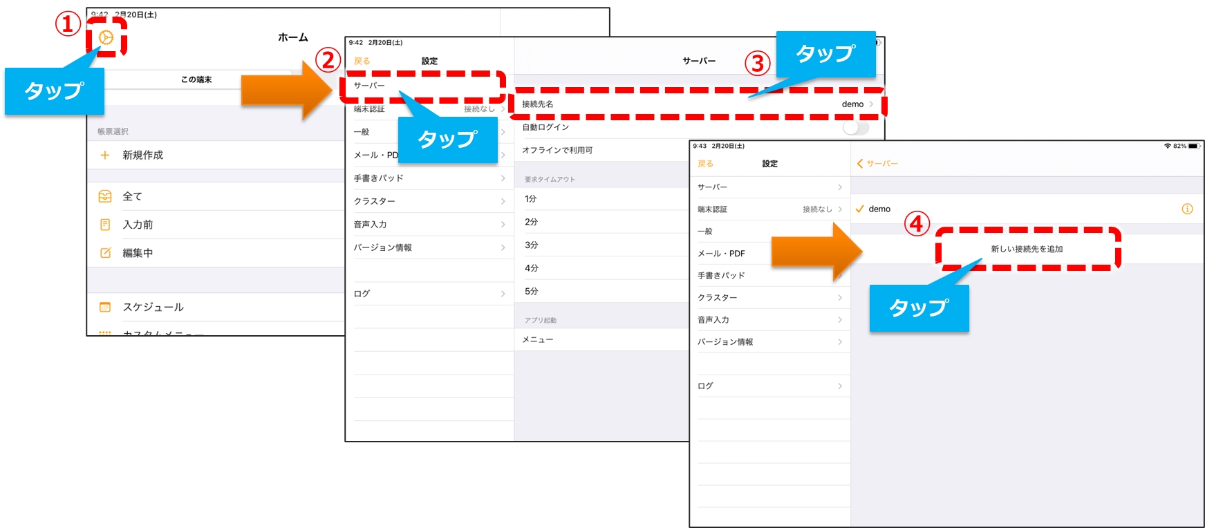 設定完了後、画面右上の「保存する」をタップして「接続先情報の入力」画面を閉じます。 「設定」画面に戻りますので、画面左上の 「戻る」 > ホーム画面右上の「ログイン」をタップして、ログイン画面を表示します。